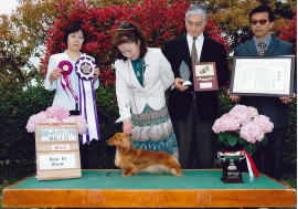 R.QUEEN / FCI千葉インターナショナルドッグショー (January 18, 2009) / Judge : James J. Mitchell (USA) BIS / 湘南ダックスフンドクラブCH展 (October 24, 2009) / Judge : 五十嵐一公 (Japan) R.QUEEN / 単犬種合同特別本部展 (December 12, 2009) / Judge : 木村庄司 (Japan) R.QUEEN / 東京西クラブ連合会展 (April 25, 2010) / Judge : RObert S. Bell (Australia) R.QUEEN / 山形県クラブ連合会展 (July 4, 2010) / Judge : 徐幼峰 (台湾) …And many others. |